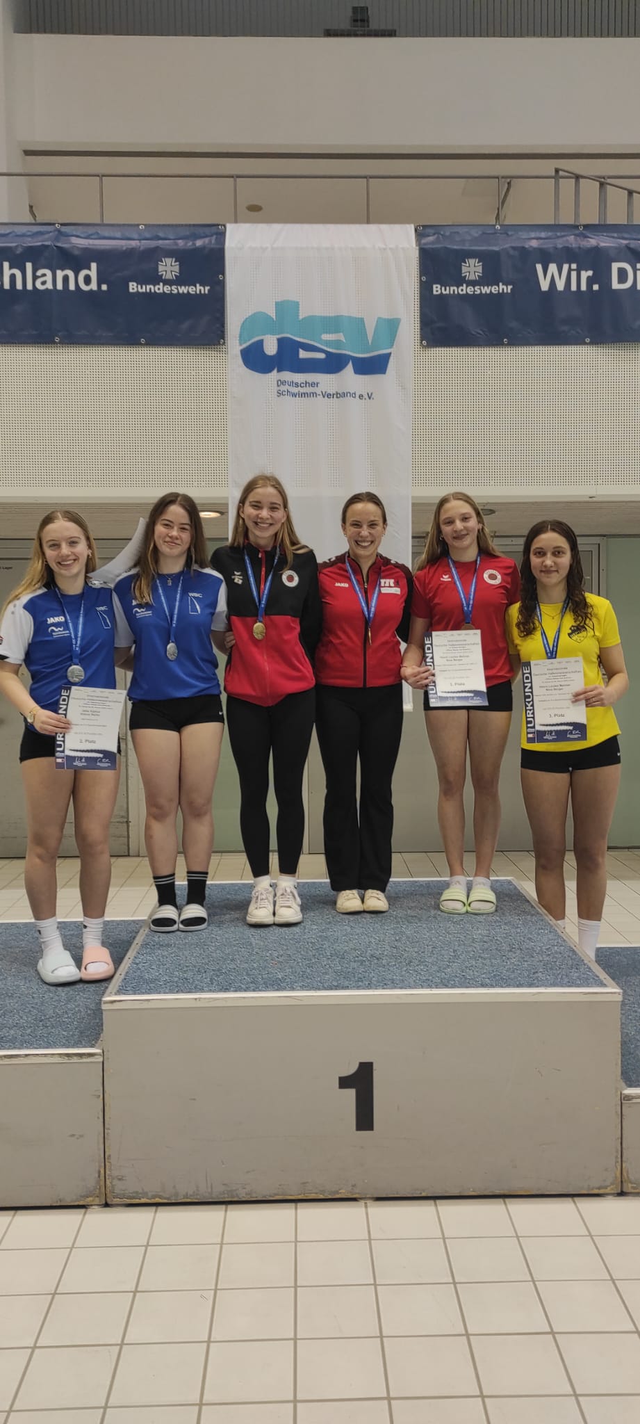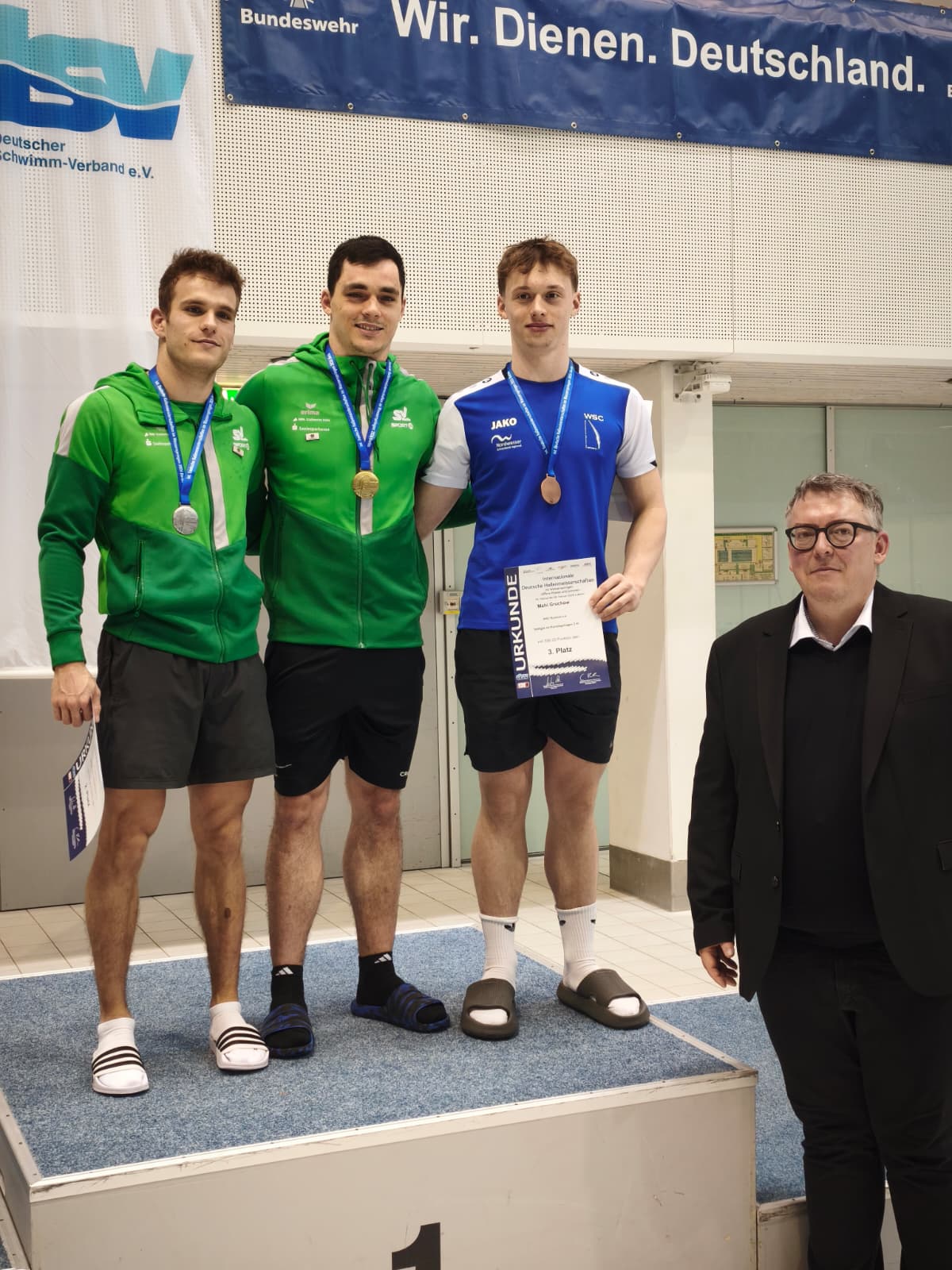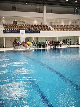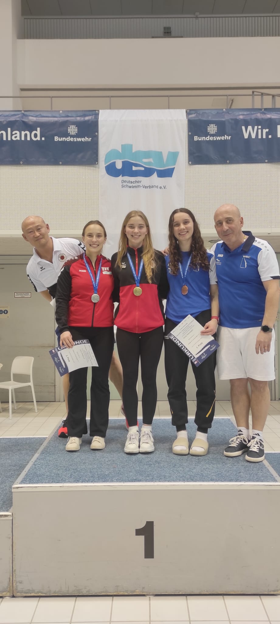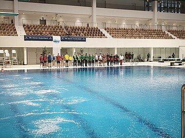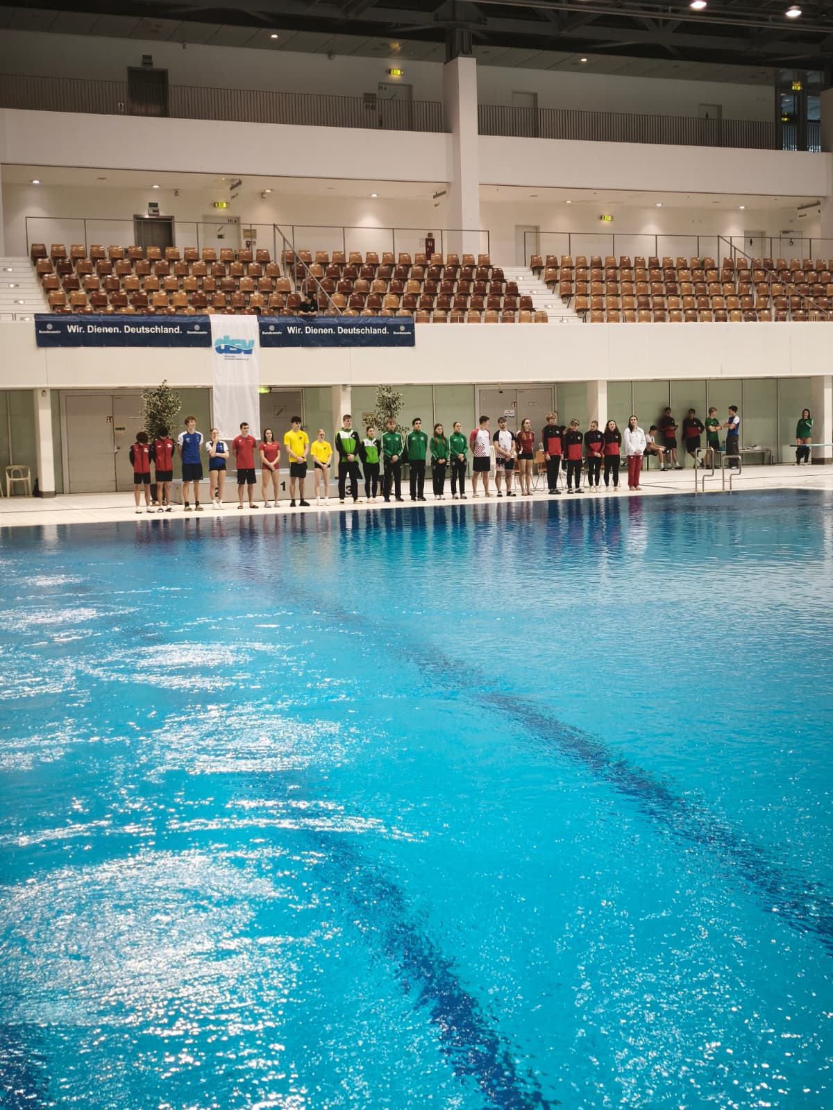Unsere erfolgshungrigen Sportlerinnen und Sportler sowie das Trainerteam können mit Stolz auf ein äußerst erfolgreiches Wettkampfwochenende bei den Offenen Internationalen Deutschen Wintermeisterschaften im Wasserspringen in Berlin zurückblicken. Jella, Aliana, Zoé, Finn, Emily, Mahi, Espen und Ole sicherten sich gemeinsam mit den Coaches Lukas Orlowski und Michail Sachiasvili, sowie Slava Khamulkin insgesamt acht Medaillen, zahlreiche Normerfüllungen sowie Empfehlungen für internationale Wettbewerbe. Darüber hinaus beeindruckte das Team mit mehreren Weltklasse-Sprüngen – ein weiteres starkes Zeichen für die hervorragende Teamarbeit.